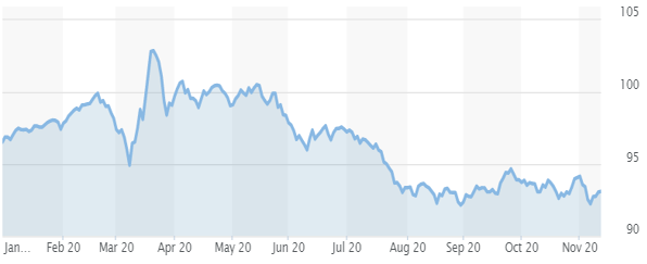 Bu iki grafik bize 2020 yılı içinde Doların değer kaybettiğini, gerek gelişmiş gerekse gelişmekte olan ülke para birimlerinin Dolara karşı değer kazandığını gösteriyor.