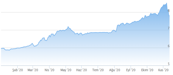 Grafikten görüleceği gibi Covid-19 salgını dolayısıyla büyük kayıpla karşılaşan gelişmekte olan ülke paraları endeksi, sonrasında toparlanarak haziran ayından bugüne kadar yükselen bir eğilim içinde görünüyor. Özetle söylemek gerekirse Gelişmekte olan ekonomilerin para birimleri Dolara karşı değer kazanıyor.